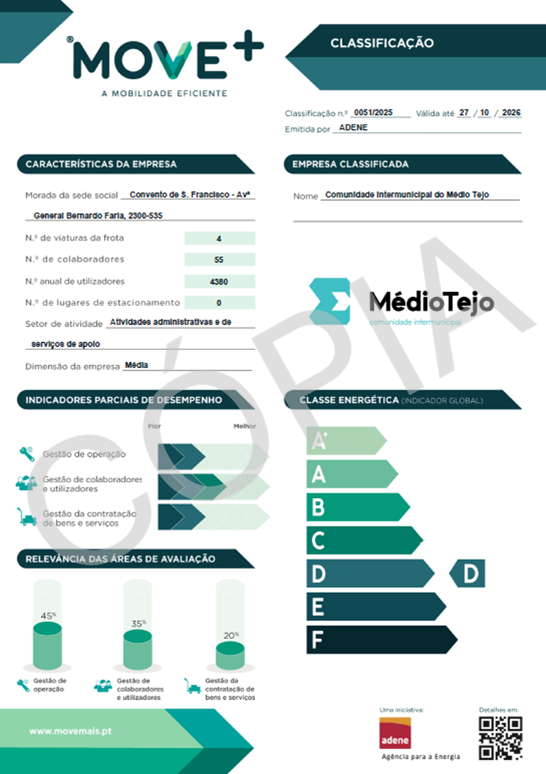 A CIM Médio Tejo obteve a classificação MOVE+ Empresas durante o processo de pilotos do MOVE+ Empresas, tendo obtido a classe D. Entre as melhores práticas adotadas pela CIM Médio Tejo estão a disponibilização de incentivos financeiros aos colaboradores para a mobilidade sustentável, como o pagamento do título de transporte público e a disponibilização de informação pública sobre os transportes públicos existentes na região em que atua.