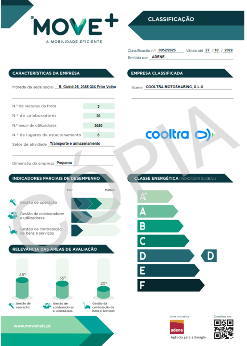 A Cooltra obteve classificação MOVE+ Empresas durante o processo de pilotos, que contribuiu para a calibração da metodologia. Obteve a classe D e com a implementação das medidas propostas pode chegar ao B.