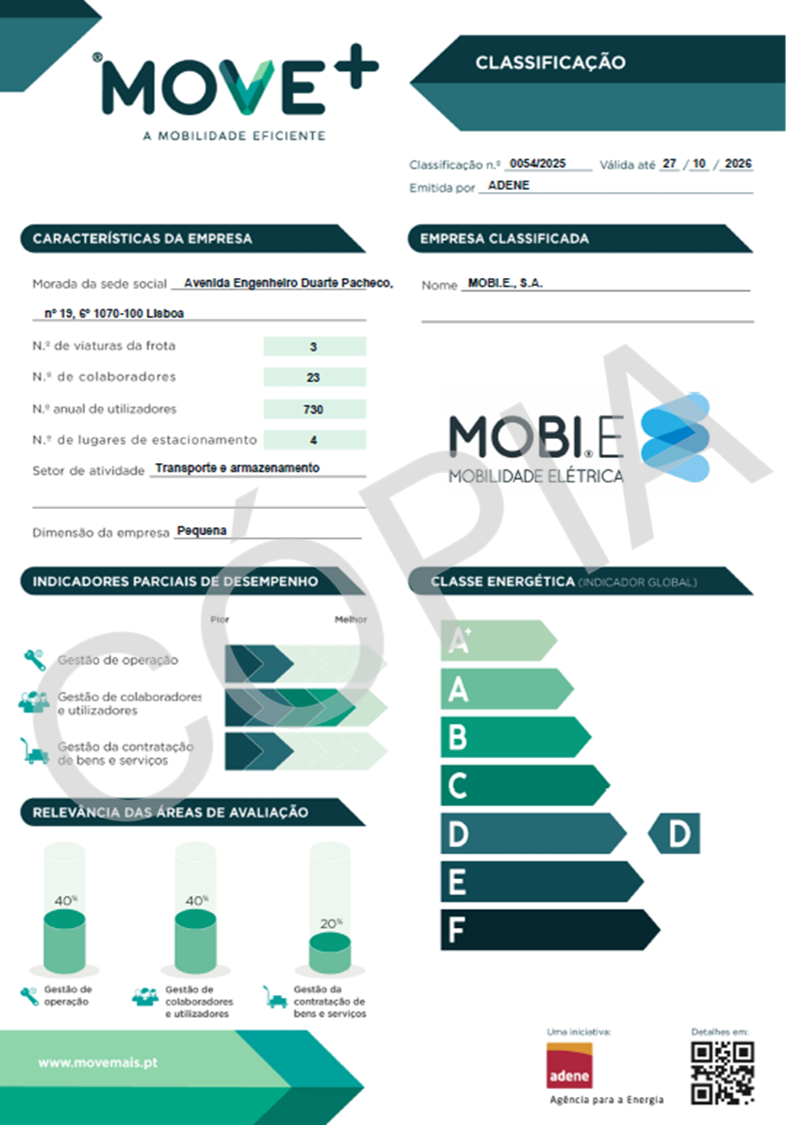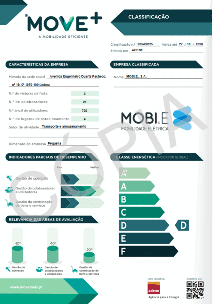 A MOBI.E obteve a classificação MOVE+ Empresas durante o processo de pilotos tendo contribuído para a calibração da metodologia. Obteve a classe D e de entre as boas práticas já adotadas destacam-se a disponibilização de postos de carregamento de viaturas elétricas nos lugares de estacionamento da entidade e a valorização de critérios de sustentabilidade na aquisição de bens e serviços que envolvem transporte.